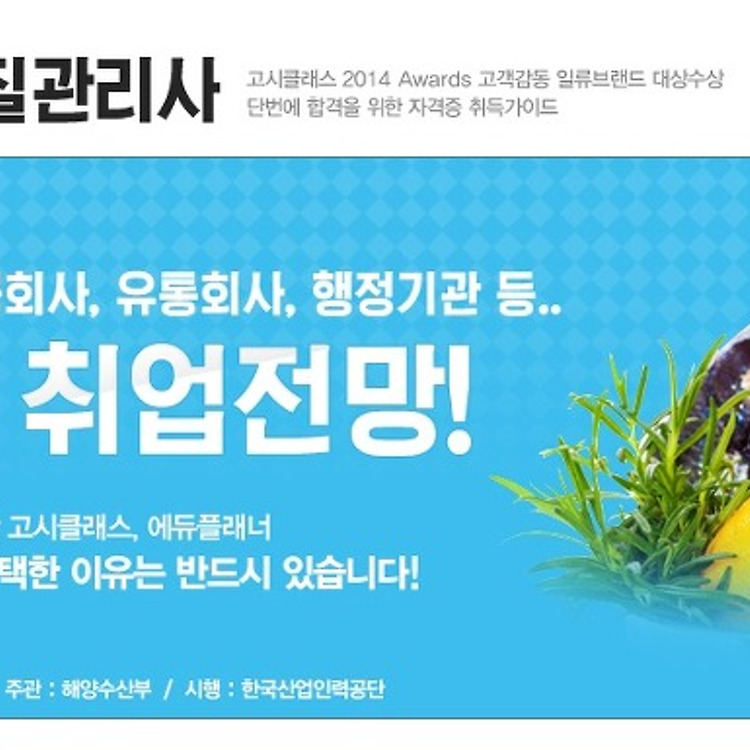 | 취업스펙 재취업 스펙 쌓기 자격증 취득 유망자격증 수산물품질관리사 시험정보 및 무료시험자료신청 (0) | 2014.12.07 |